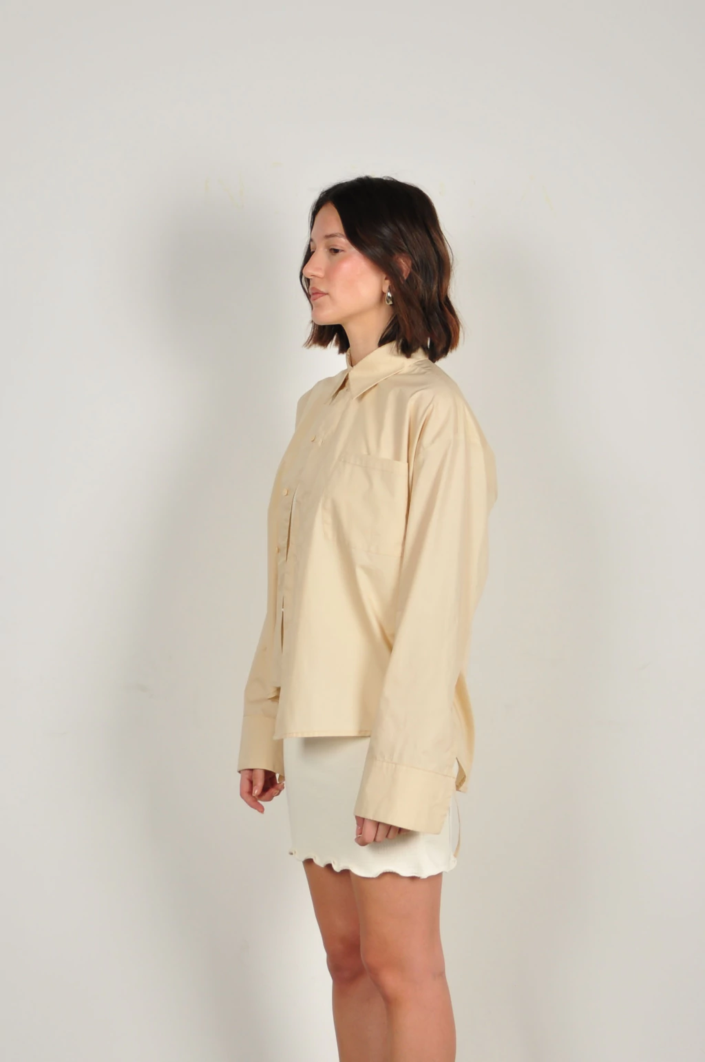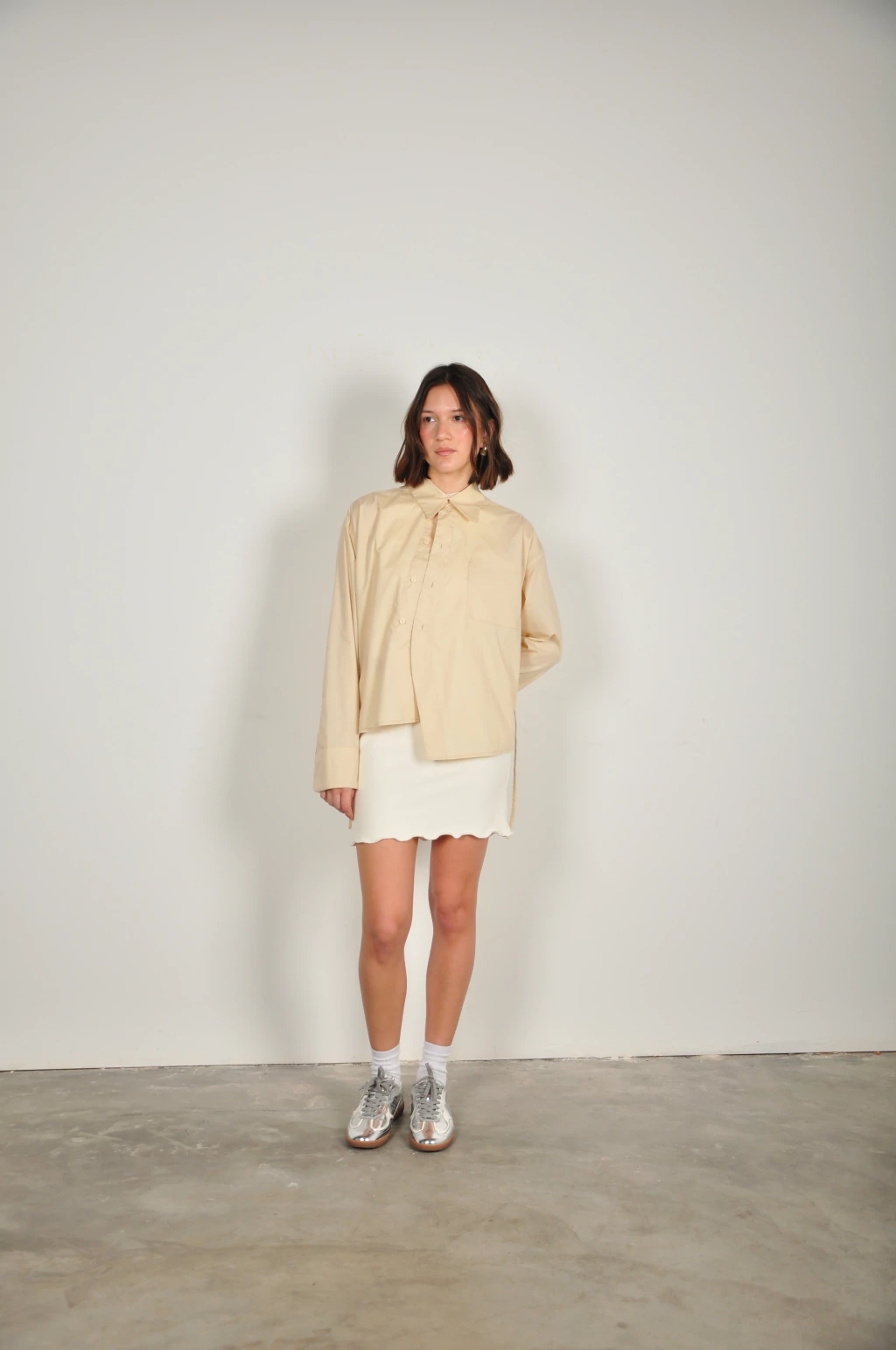 La camisa CURVA está confeccionada en poplin de algodón, de superficie lisa, pareja y con leve brillo natural. Su cruce es curvo y el bolsillo plaqué delantero del lado izquierdo sigue su forma. Tiene una tira en cada lateral para que puedas ajustarla y que su silueta quede más ceñida. Tiene otro bolsillo plaqué en la espalda del lado derecho, para que puedas usarla al revés también. Sus delanteros son asimétricos. Está confeccionada íntegramente con costuras francesas. Botones a tono. Su diseño es versátil y atemporal.