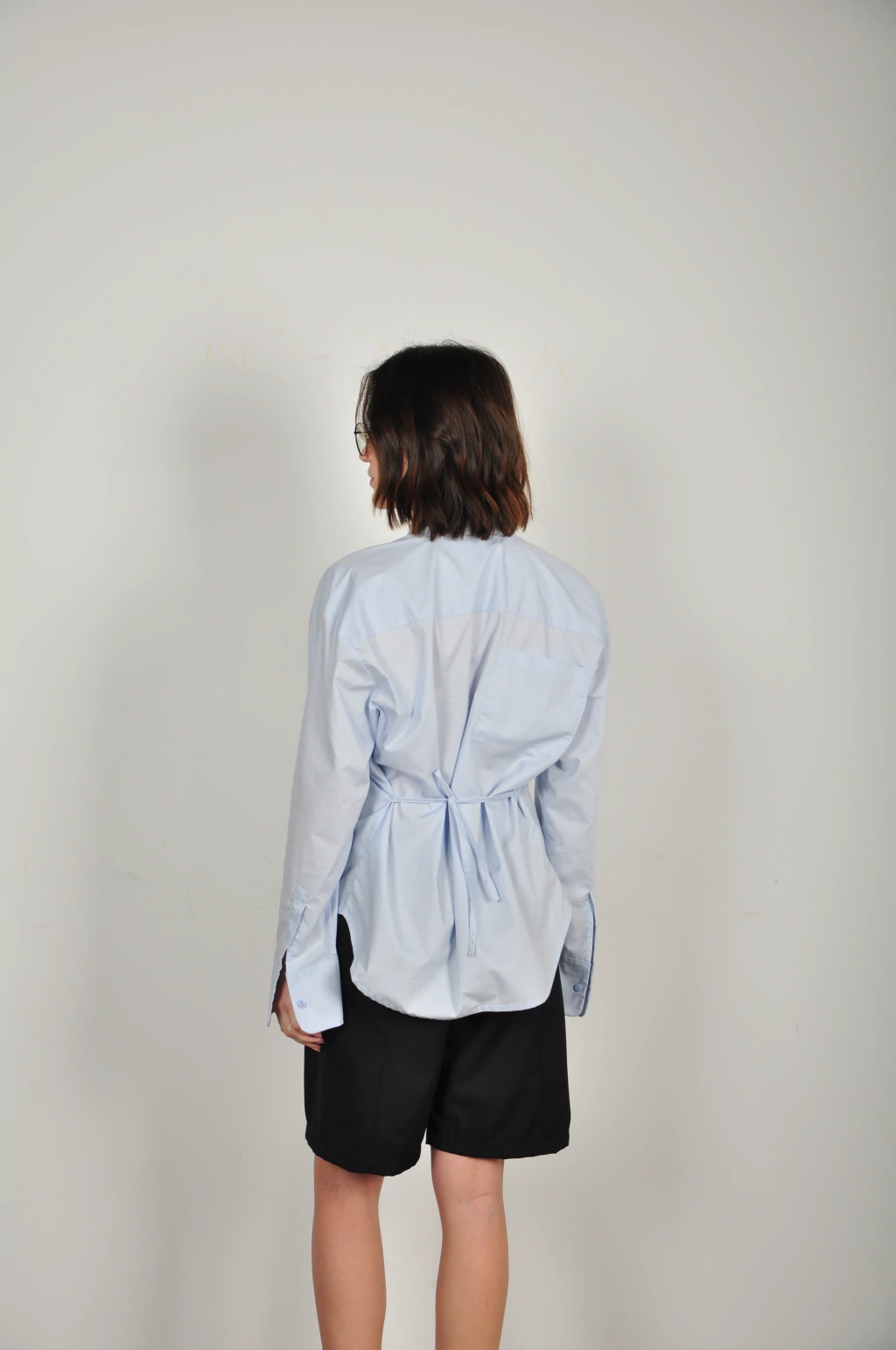La camisa CURVA está confeccionada en poplin de algodón, de superficie lisa, pareja y con leve brillo natural. Su cruce es curvo y el bolsillo plaqué delantero del lado izquierdo sigue su forma. Tiene una tira en cada lateral para que puedas ajustarla y que su silueta quede más ceñida. Tiene otro bolsillo plaqué en la espalda del lado derecho, para que puedas usarla al revés también. Sus delanteros son asimétricos. Está confeccionada íntegramente con costuras francesas. Botones a tono. Su diseño es versátil y atemporal.